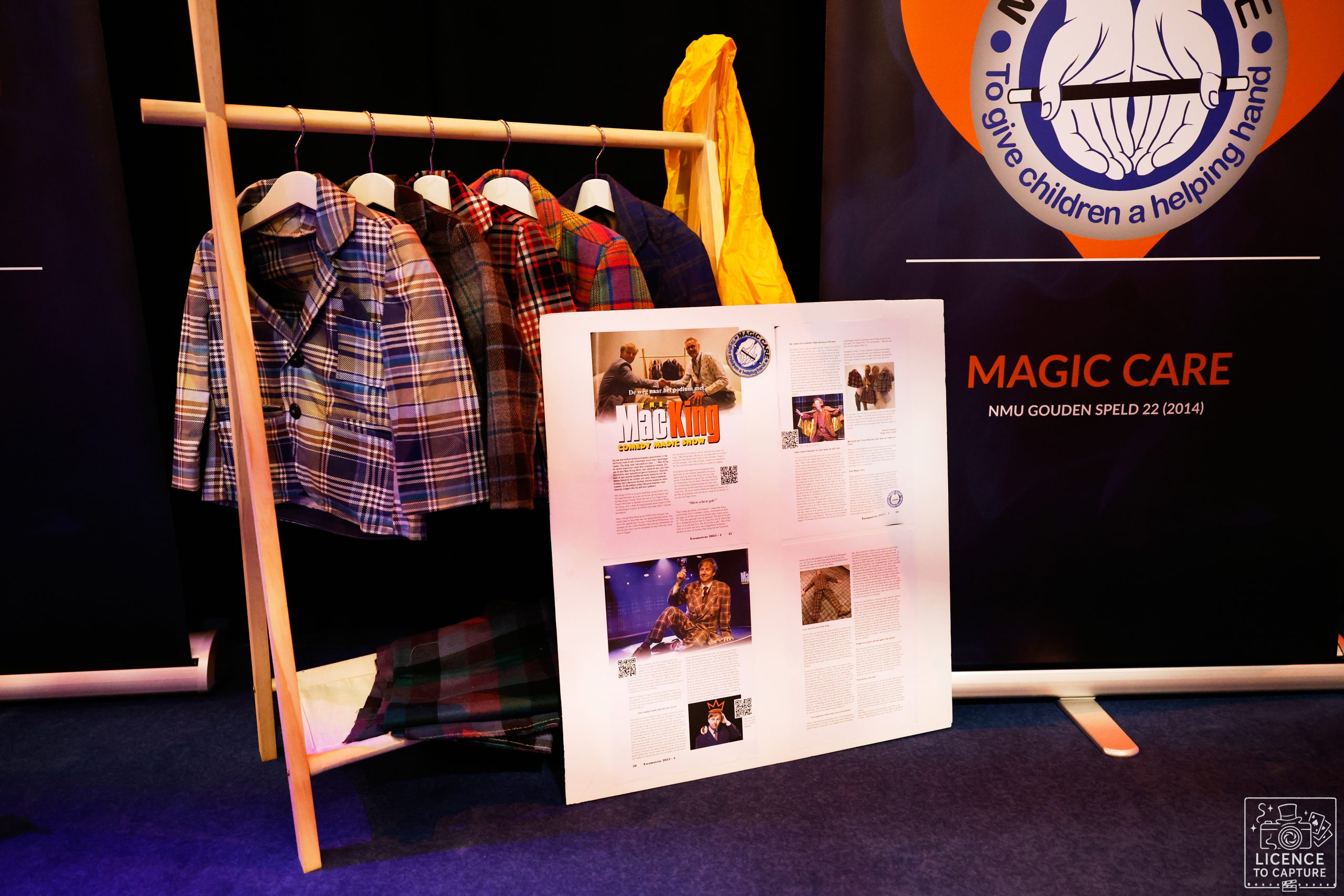 Tussen de shows door was er voldoende tijd om de stand te bezoeken van Magic Care. Marlies Greve (voorzitter en lid van NBG) vertelde vol enthousiasme over de inzet van de vele vrijwilligers voor deze stichting die zeer goed werk doen. Ook hingen op een klein kapstokje de XXXS geruite jasjes netjes op een rij. Deze zijn gebruikt door Marcel Verbakel voor een interview met Mac King en door deze living legend gesigneerd (te lezen in de Escamoteur en Informagie). Daar kon op geboden worden.